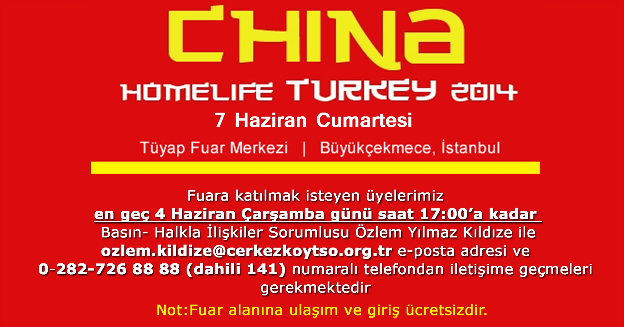 Katılmak isteyen firmaların 4 Haziran Çarşamba günü saat 17:00’a kadar ÇTSO Basın- Halkla İlişkiler Sorumlusu Özlem Yılmaz Kıldıze ile ozlem.kildize@cerkezkoytso.org.tr e-posta adresi ve 282-726 88 88 (dahili 141) telefonundan iletişime geçmeleri gerekmektedir.