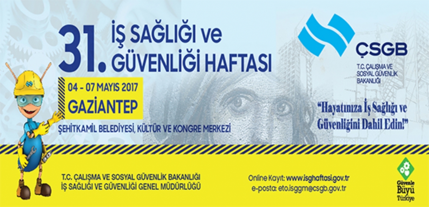 Çalışma ve Sosyal Güvenlik Bakanlığınca bu yıl 31 incisi düzenlenecek olan İş Sağlığı ve Güvenliği Haftası birçok alandan akademisyenlerin, uzmanların, ulusal ve uluslararası kuruluşların, meslek odaları ve sivil toplum örgütlerinden temsilcilerin katılımı ile "4-7 Mayıs 2017" tarihleri arasında Gaziantep'te Şehitkâmil Belediyesi Kültür ve Kongre Merkezinde gerçekleştirilecektir. İSG Haftası kayıtları ücretsiz olup kayıt ile ilgili tüm detaylara http://www.isghaftasi.gov.tr/ adresinden ulaşılabilmektedir.