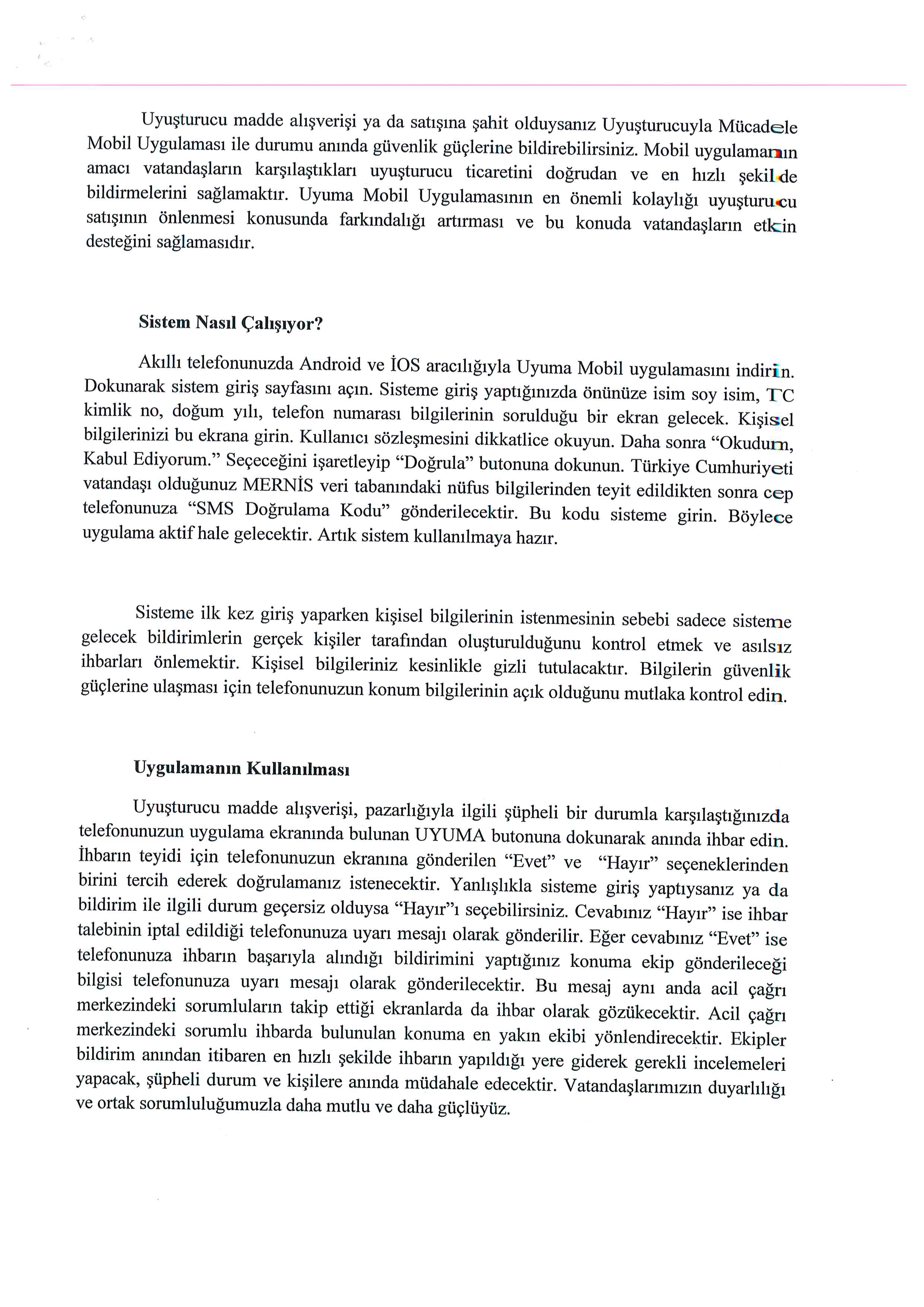 Çerkezköy Kaymakamlığı’ndan tarafımıza iletilen yazıda, İçişleri Bakanlığı tarafından uyuşturucu ile mücadelede farkındalığın artması ve bu konuda vatandaşlarımızın etkin desteğini sağlamak üzere yeni bir “Uyuma Mobil Uygulaması” başlatılmış olup, “Uygulama Kılavuzu” gönderilmiştir.
