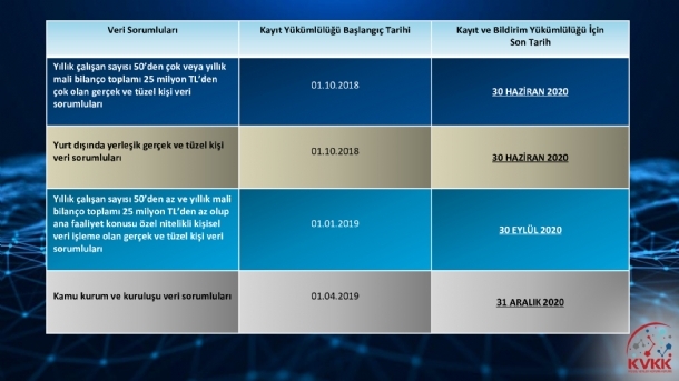 - Yıllık çalışan sayısı 50’den çok veya yıllık mali bilanço toplamı 25 milyon TL’den çok olan gerçek ve tüzel kişi veri sorumlularına Sicile kayıt ve bildirim yükümlülüğünü yerine getirmeleri için verilen sürenin 30.06.2020 tarihine,