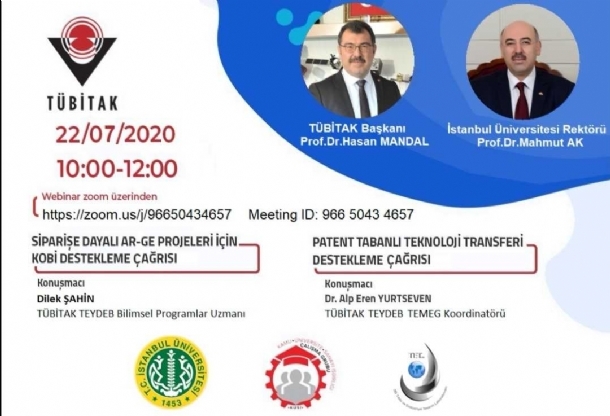 İstanbul Üniversitesi Rektörlüğü'nün 20.07.2020 tarih ve 35980450-0 sayılı duyurusunda bahsedildiği üzere 22.07.2020 günü saat 10:00-12:00 aralığında TÜBİTAK Başkanı Sayın Prof. Dr. Hasan MANDAL ve İstanbul Üniversitesi Rektörü Prof. Dr. Mahmut AK'ın katılacağı "Siparişe Dayalı Ar-Ge Projeleri İçin KOBİ Destekleme Programı" ve "Patent Tabanlı Teknoloji Transferi Destekleme Programı" konularında video konferans yöntemiyle toplantı düzenlenecektir.