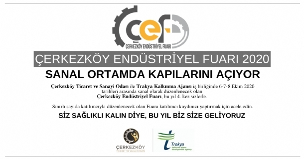 Çerkezköy Ticaret ve Sanayi Odası ile Trakya Kalkınma Ajansı iş birliğinde 6-7-8 Ekim 2020 tarihleri arasında sanal olarak düzenlenecek olan Çerkezköy Endüstriyel Fuarı, bu yıl 4. kez sizlerle.