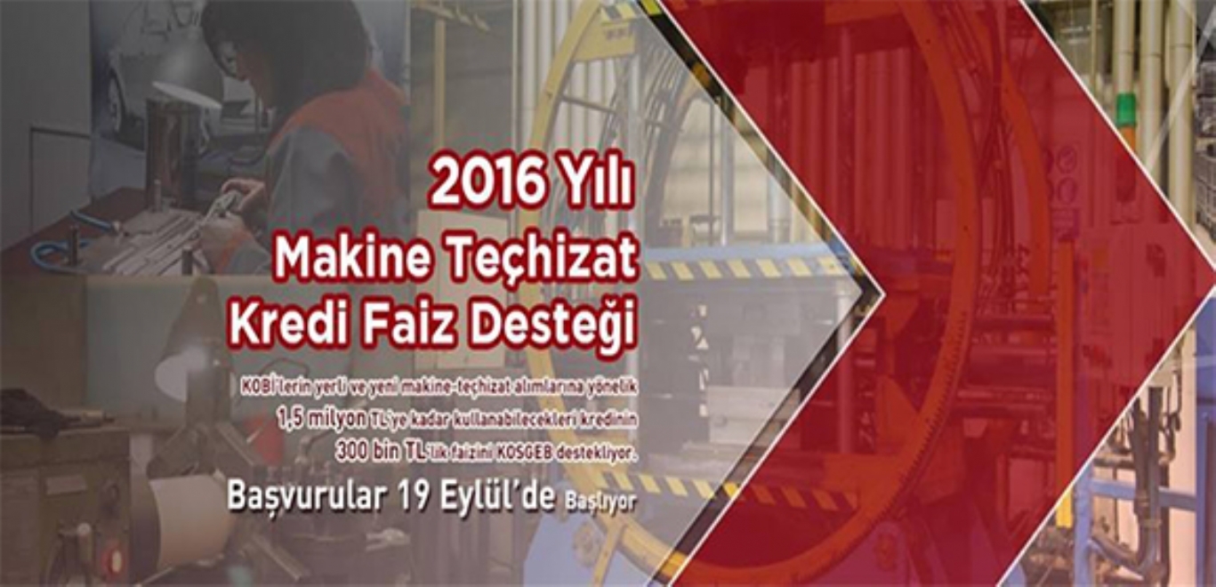 2016 Yılı Makine Teçhizat Kredi Faiz Desteği, 19 Eylül 2016 tarihinde işletmelerin internet üzerinden başvurularının alınmasıyla başlayacak olup, ayrıntılı bilgiye Odamız ya da www.kosgeb.gov.tr adresinden ulaşılabilir.