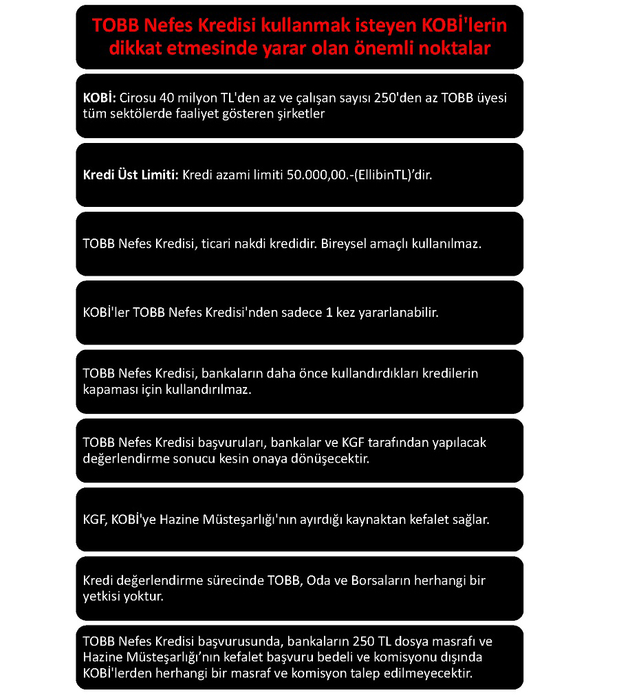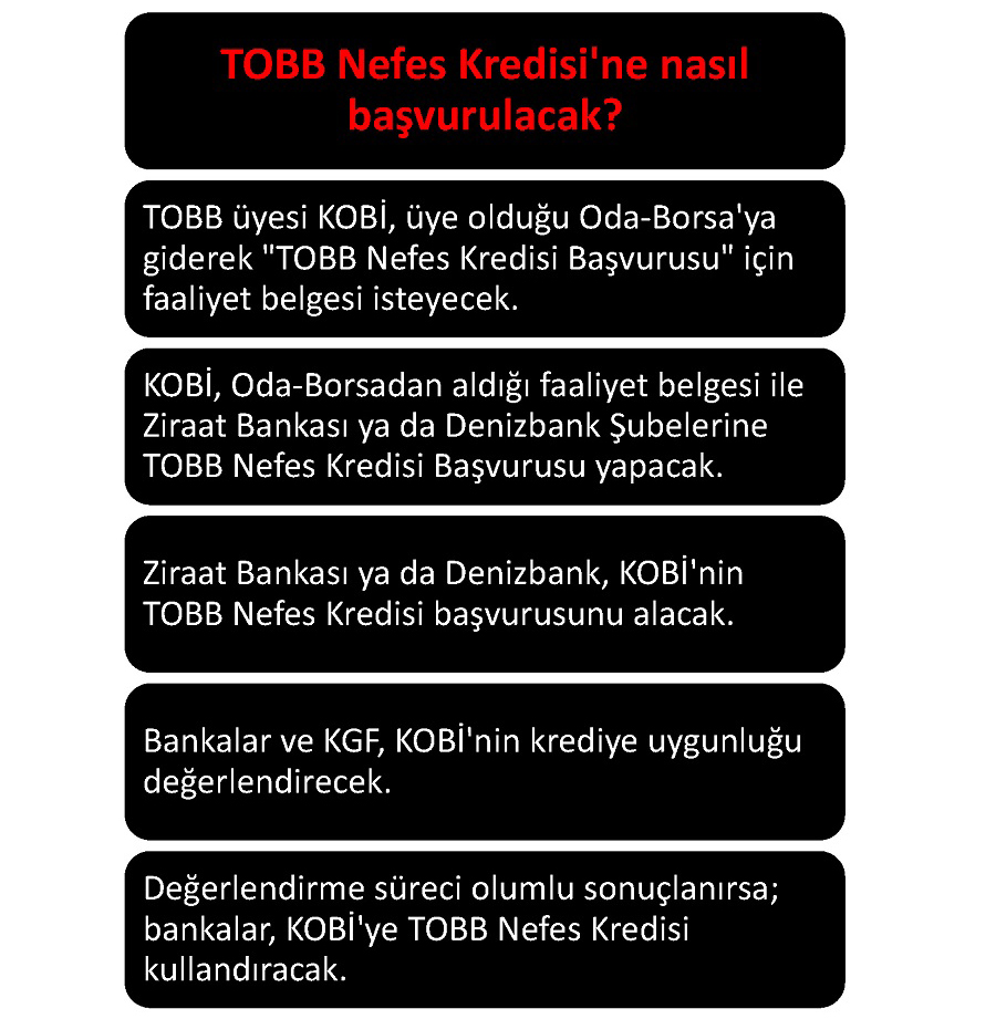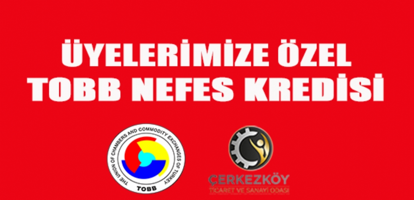 f) Üyelerimiz TOBB Nefes Kredisi’ne başvurabilmek için öncelikle odamızdan açıklama olarak “TOBB Nefes Kredisi Başvurusu İçindir.” ibareli faaliyet belgesi alacaklardır. (Bu belge olmadan banka talep kabul etmeyecektir.) Daha sonra üyelerimiz T.C. Ziraat Bankası A.Ş. ve Denizbank A.Ş.’nin Çerkezköy’de bulunan herhangi bir şubesine giderek bankanın talep edeceği kredi evrakları ile müracaat edecektir.